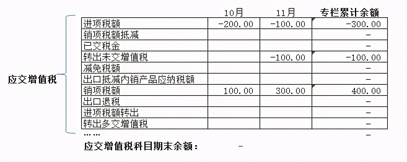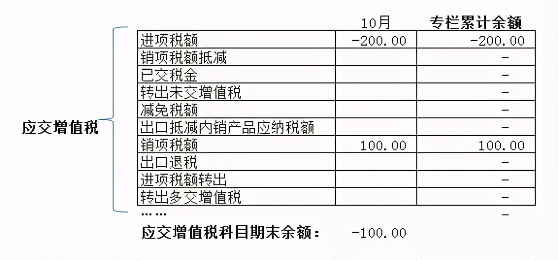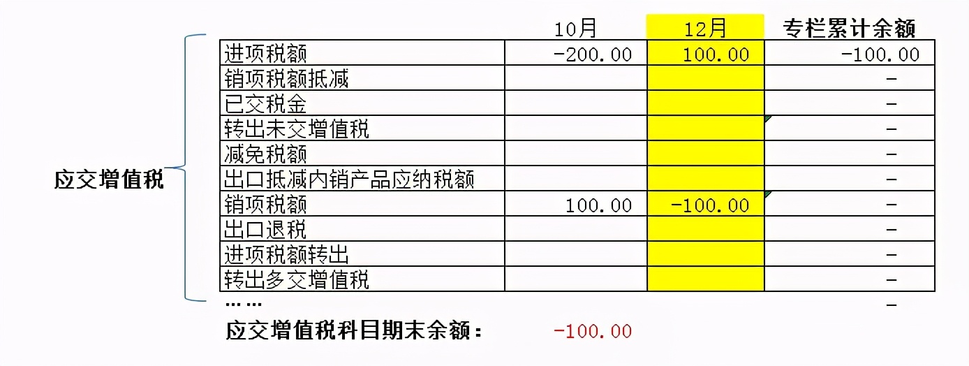 借方用负数表示,贷方用正数表示,我们可以从表格看出,应交增值税科目的期末余额是借方100,相当于留抵扣。那么其实应交增值税各专栏的余额是没有清理掉的。