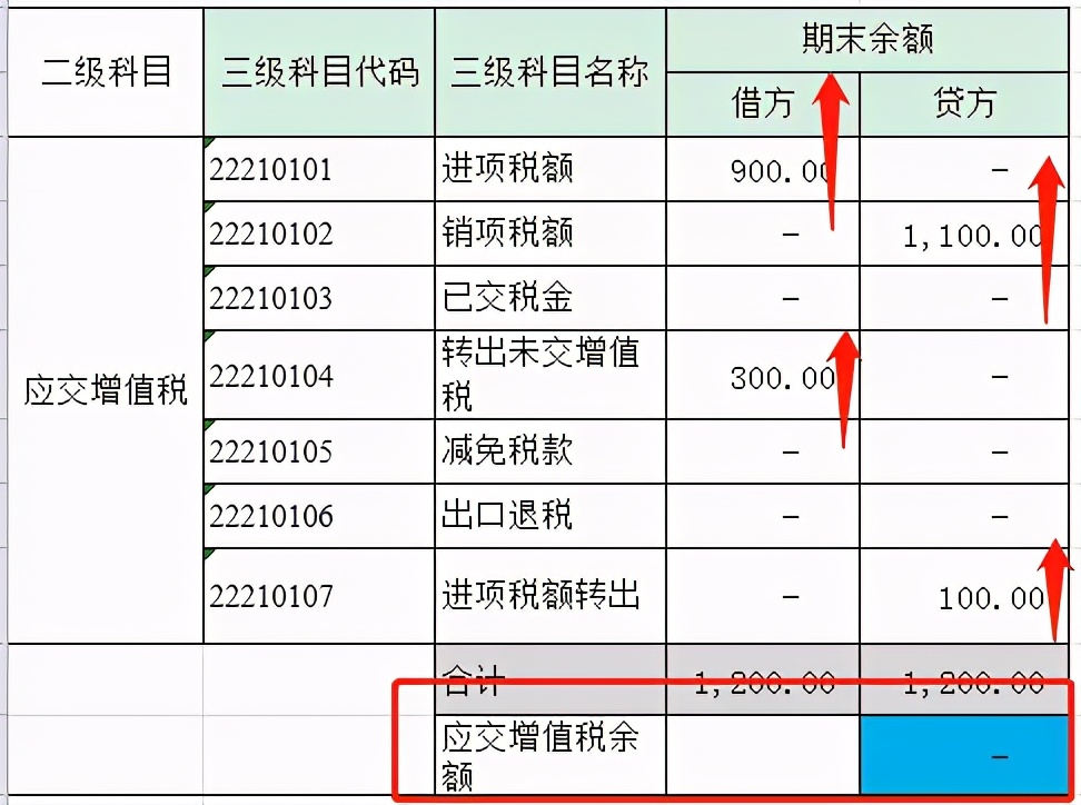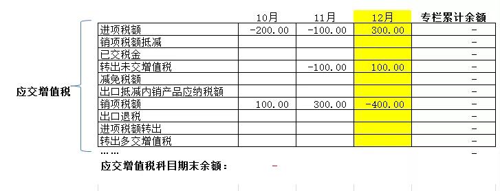 因此,你所有的业务就不是像小规模纳税人在二级科目应交增值税里面做了,而是需要具体细化到应交增值税的明细专栏中去。做法大家都很清楚,今天文章的关键是说说这些专栏期末余额的问题。