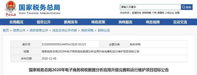 11月6日,税务总局发布《2020年电子商务税收数据分析应用升级完善和运行维护项目》招标公告: