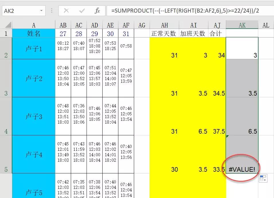 用文本函数提取出来的时间是文本格式,不能直接比较,需要转换成数值格式,前面加--转换即可。按照目前思路,嵌套SUMPRODUCT函数应该可以解决,可万万没想到,公式往下拉又出错了。