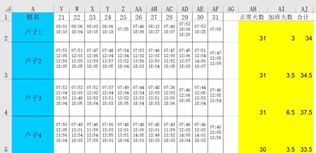 问题,要统计正常天数、加班天数、合计。加班天数的计算标准,只要当天有22:00打卡的算半天。