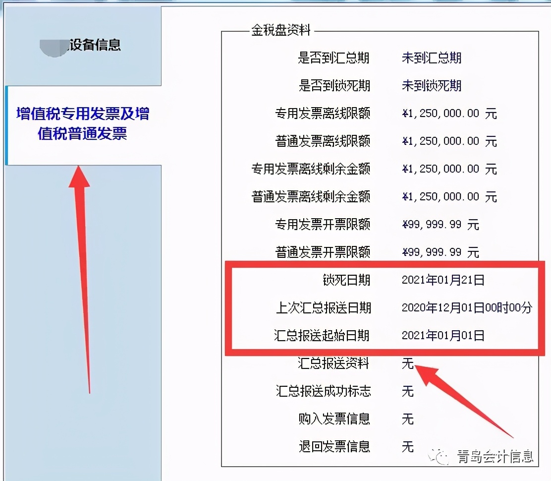 点击确定以后,进入增值税发票开票软件,系统维护,状态查询后,然后再点击增值税专用发票及增值税普通发票那里,会显示:锁死日期2021年1月21号,汇总报送起始日期2021年1月1号。这就说明小规模纳税人已经完成清卡的操作。如下图: