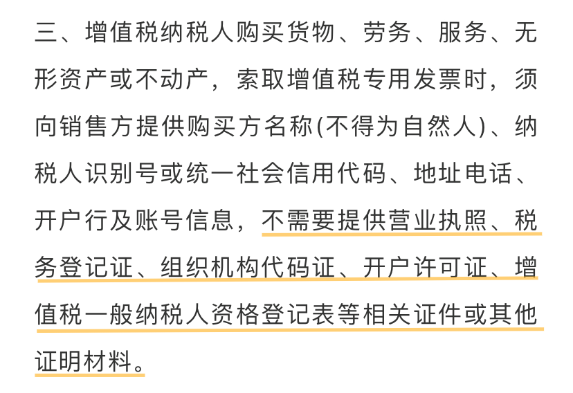 其实这方面税务局确实已经明确过了,索取增值税专用发票时,只需要提供开票信息即可,不需要提供诸如营业执照、税务登记证、组织机构代码证、开户许可证、增值税一般纳税人资格登记表等相关证件或其他证明材料。