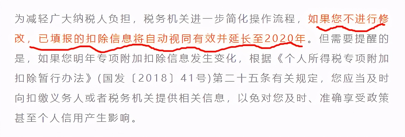 但是实际上,这种简便方法其实并不好,一方面不利于养成纳税人关注自身专项附加扣除的习惯,更重要的是如您享受专项附加扣除政策的条件发生变化而不进行修改、仍按原条件在明年继续享受,还可能影响您的纳税信用。