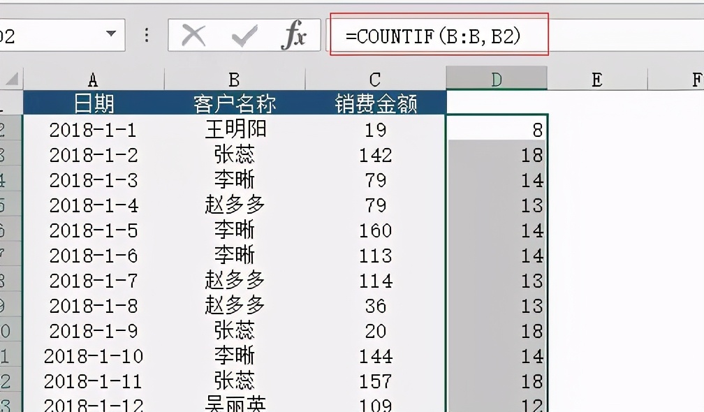 注:公式中的重点是$的使用,它可以固定B$2:B2区域的首行是第2行,而向下复制会变成B$2:B3、B$2:B4、B$2:B5....构成一个逐渐拉伸的区域。