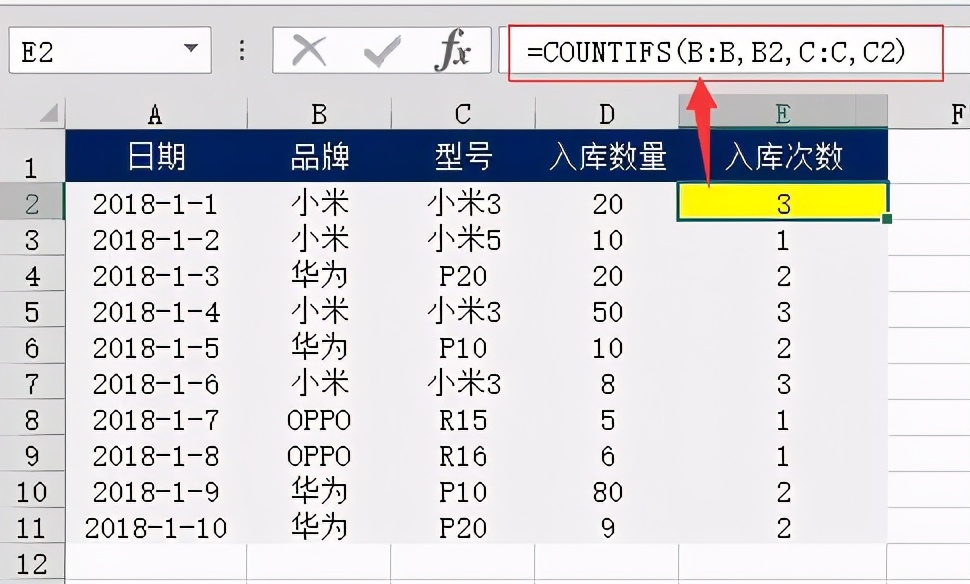 如果是多列计算重复次数呢?如下面的根据品牌和型号来统计入库次数