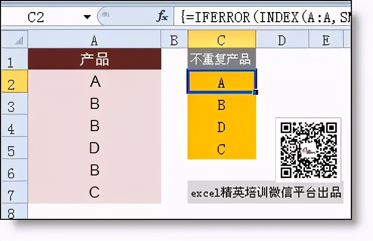 =IFERROR(INDEX(A:A,SMALL(IF(MATCH(A$2:A$7,A$2:A$7,0)=ROW(A$1:A$6),ROW(A$2:A$7)),ROW(A1))),"")
