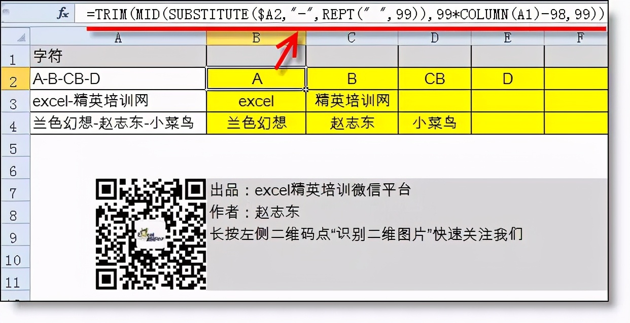 =TRIM(MID(SUBSTITUTE($A2,"-",REPT(" ",99)),99*COLUMN(A1)-98,99))