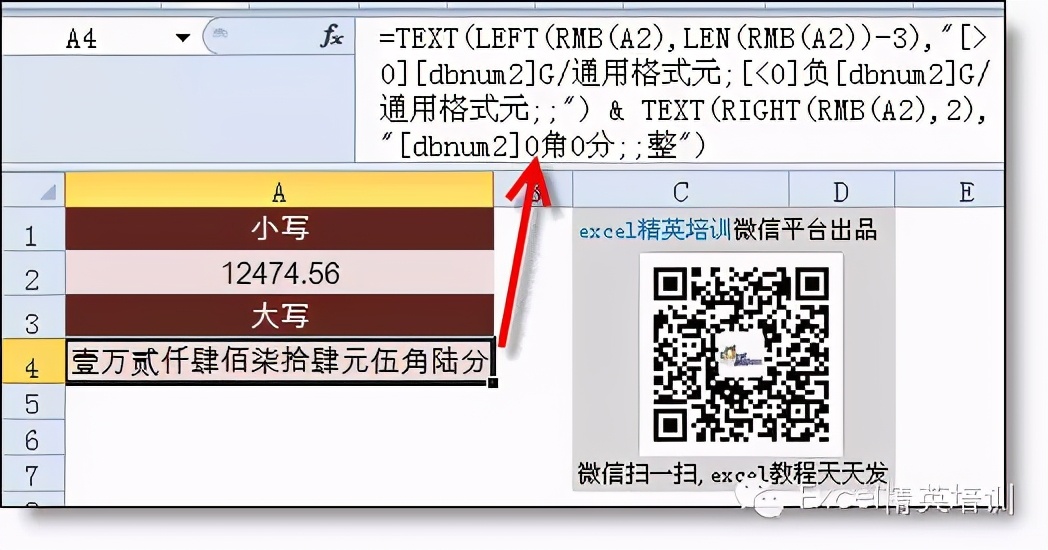 =TEXT(LEFT(RMB(A2),LEN(RMB(A2))-3),"[>0][dbnum2]G/通用格式元;[<0]负[dbnum2]G/通用格式元;;") & TEXT(RIGHT(RMB(A2),2),"[dbnum2]0角0分;;整")