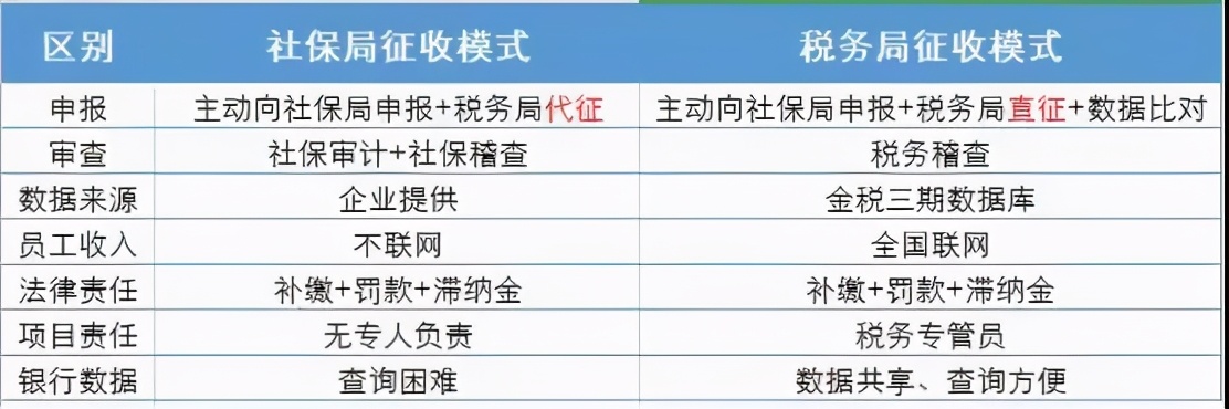 其实,将各项社会保险费转交税务局征收,是党的十九届三中全会做出的重大决策,自2019年1月1日起,河北省、浙江省、福建省、黑龙江省等就已经由税局统一征收社会保险费了,但各地推进进度有差异,近日,一大波省市“社保入税”。代征变直征,主要区别如下图所示:
