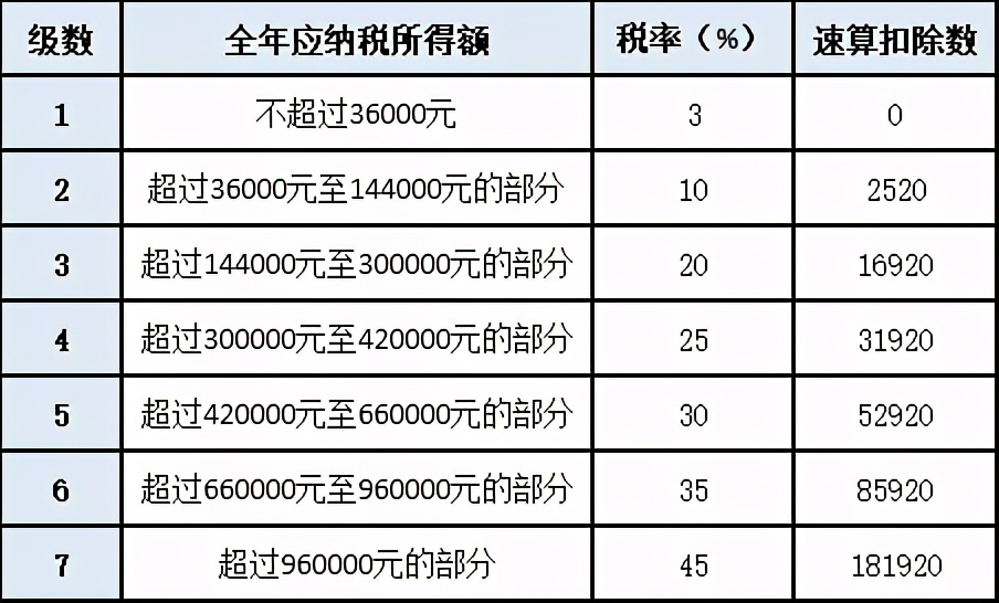以全年一次性奖金收入除以12个月得到的数额,按照所附按月换算后的综合所得税率表(以下简称月度税率表),确定适用税率和速算扣除数,单独计算纳税。计算公式为:
