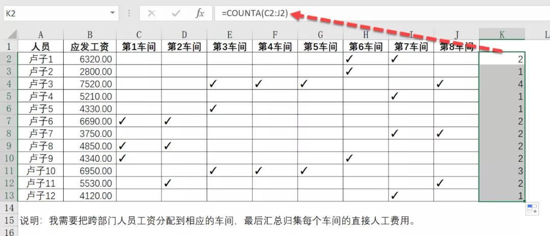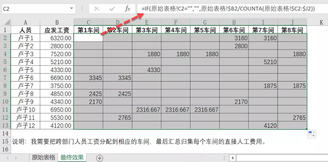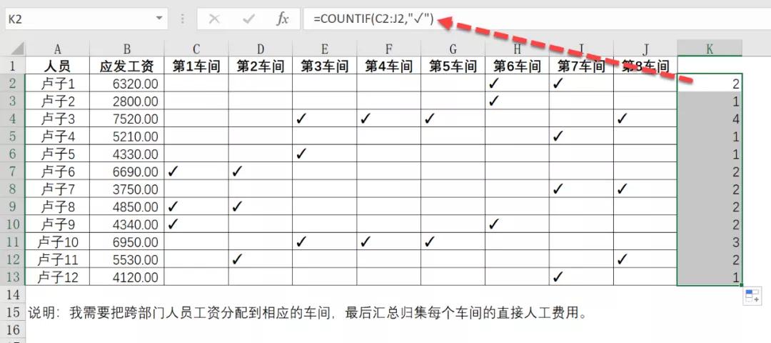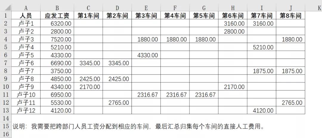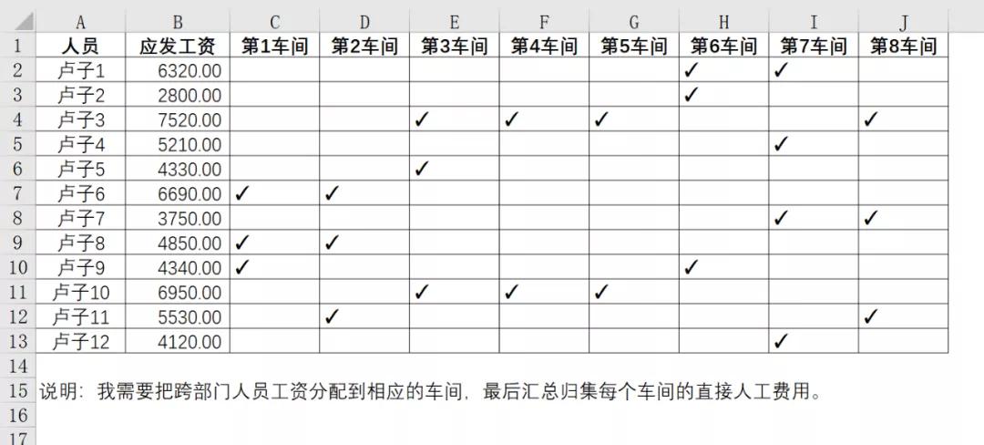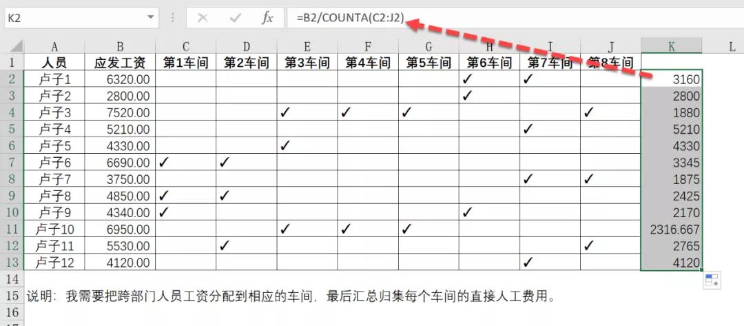 举个例子,比如卢子1,在第6车间和第7车间都✓,就将应发工资6320除以2,得到3160,再将这3160放在✓的单元格。