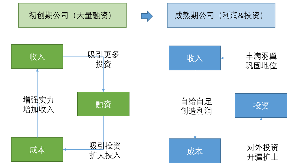 这里可以借用MVP(minimum viable product 最小可行性产品)的概念。企业经营,本质要解决收入与成本的问题。在经营早期,企业的MVP应证明自己有能力产生收入,从而吸引大家对内投资,将MVP做大。而企业成熟后,可以基于MVP模式做扩展,源源不断创造现金流,进而支持对外投资(如下图所示)